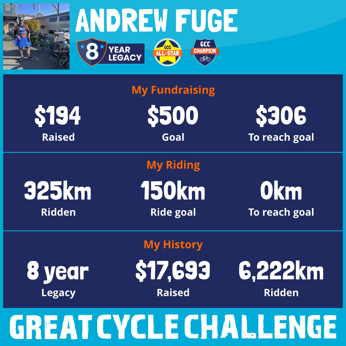 This October, in memory of my mum who passed away from Cancer, I am cycling 400km in her memory also aim to raise $2500, and is also my 7th year for The Great Cycle Challenge to fight kids' cancer as no-one should have to battle cancer regardless of their age.