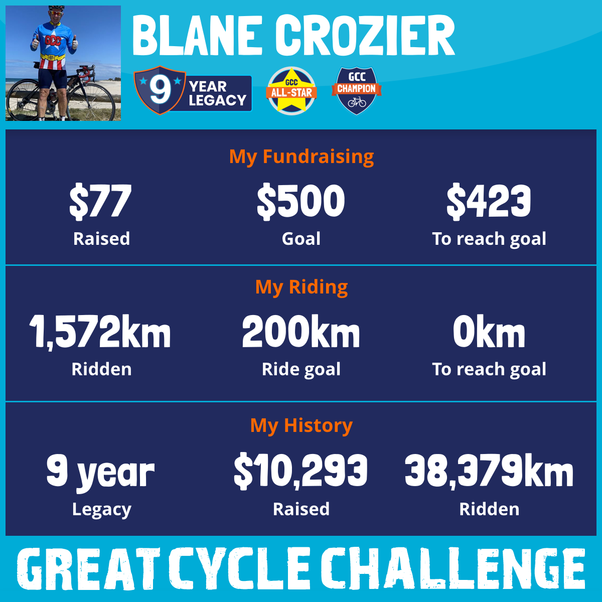 This October, I am again taking part in the Great Cycle Challenge to fight kids' cancer, but this year is slightly different. This year I am riding for a close friend, Wayne RICHTER, who is currently battling blood cancer, requiring a bone marrow transplant. At the time of riding the Great Cycle Challenge we will be hoping for great news that the transplant has been successful.