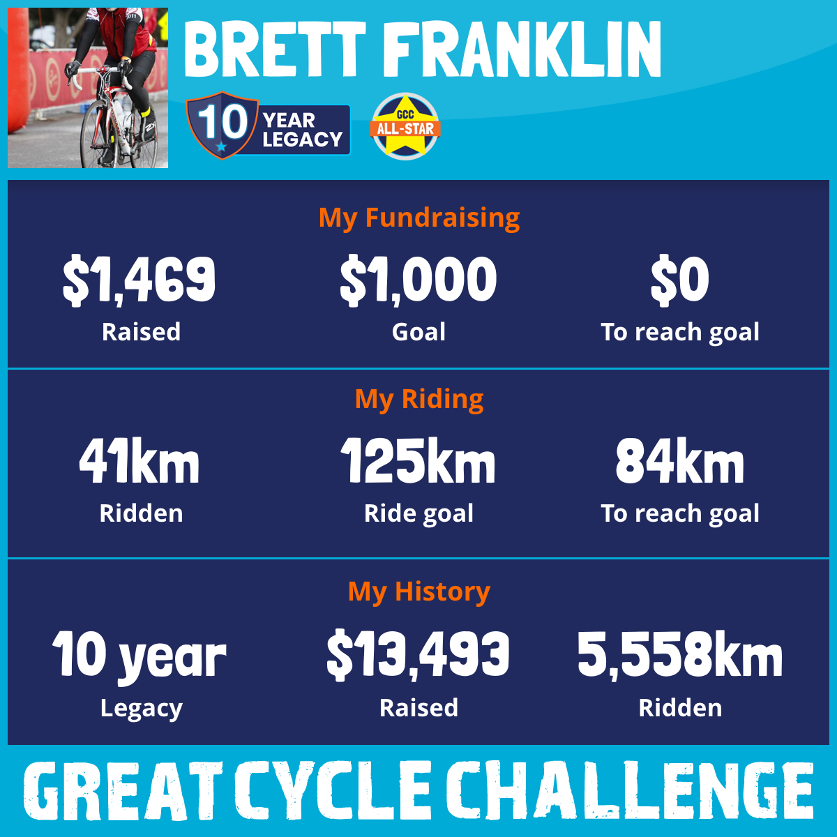 I was in my early 50's, so seeing these kids go through far worse challenges is heartbreaking and i cannot imagine what they are going through but i see the support they get from CMRI and the difference that each little donation makes when all put together so this October I am once again taking part in the Great Cycle Challenge to fight kids' cancer for my 10th year!