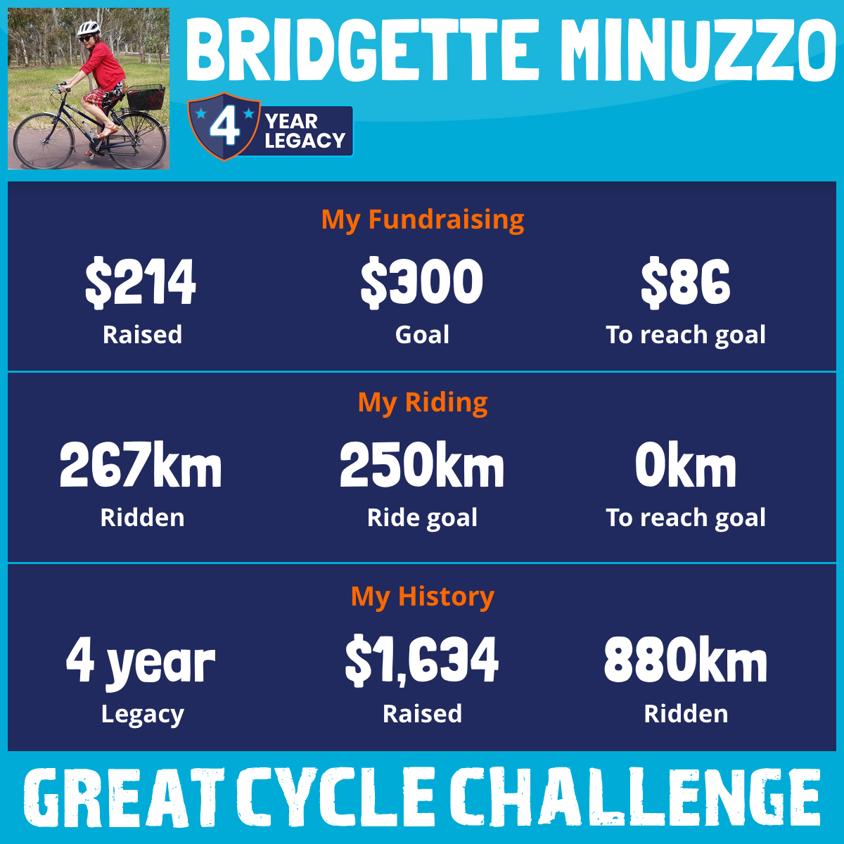 And so I am riding and raising funds to support the Children's Medical Research Institute to continue their work into the prevention, diagnosis, treatment and finding a cure for childhood cancer.