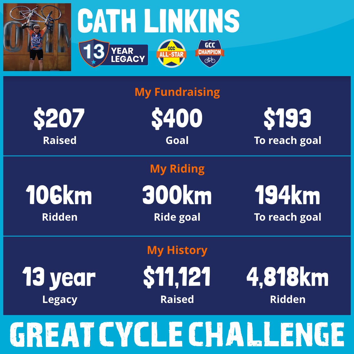 And so I am riding and raising funds to support the Children's Medical Research Institute to continue their work into the prevention, diagnosis, treatment and finding a cure for childhood cancer.