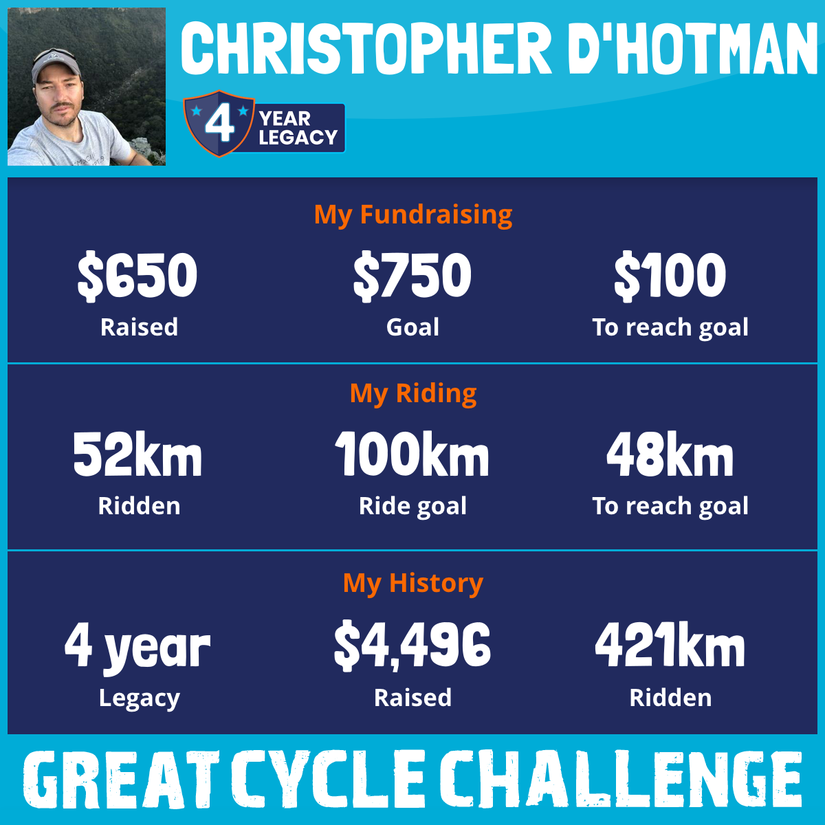 You can donate through my fundraising page here: https://greatcyclechallenge.com.au/Riders/CdH