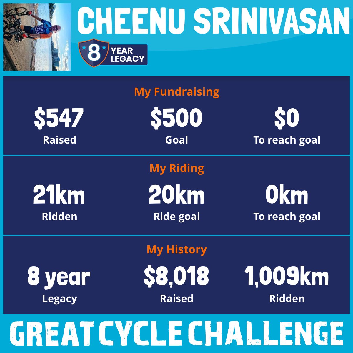 And so I am riding and raising funds to support the Children's Medical Research Institute to continue their work into the prevention, diagnosis, treatment and finding a cure for childhood cancer.
