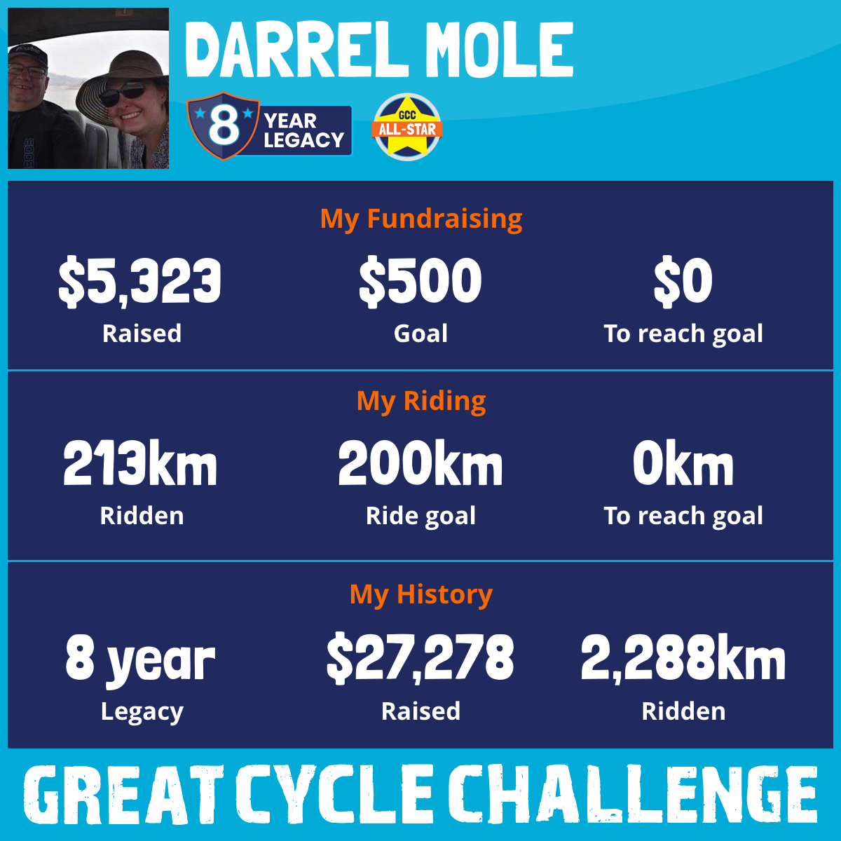 Just over seven and a half years ago my daughter, Katelyn, was diagnosed with cancer (Acute Myeloid Leukaemia). After numerous rounds of chemo she had a stem cell transplant in July 2018. While she was being treated at Westmead I got involved in the Great Cycle Challenge to help raise awareness and funds for fighting kids' cancer. Even though Katie wasn't a "kid" when she was diagnosed finding a cure for childhood cancer will benefit all cancer sufferers.