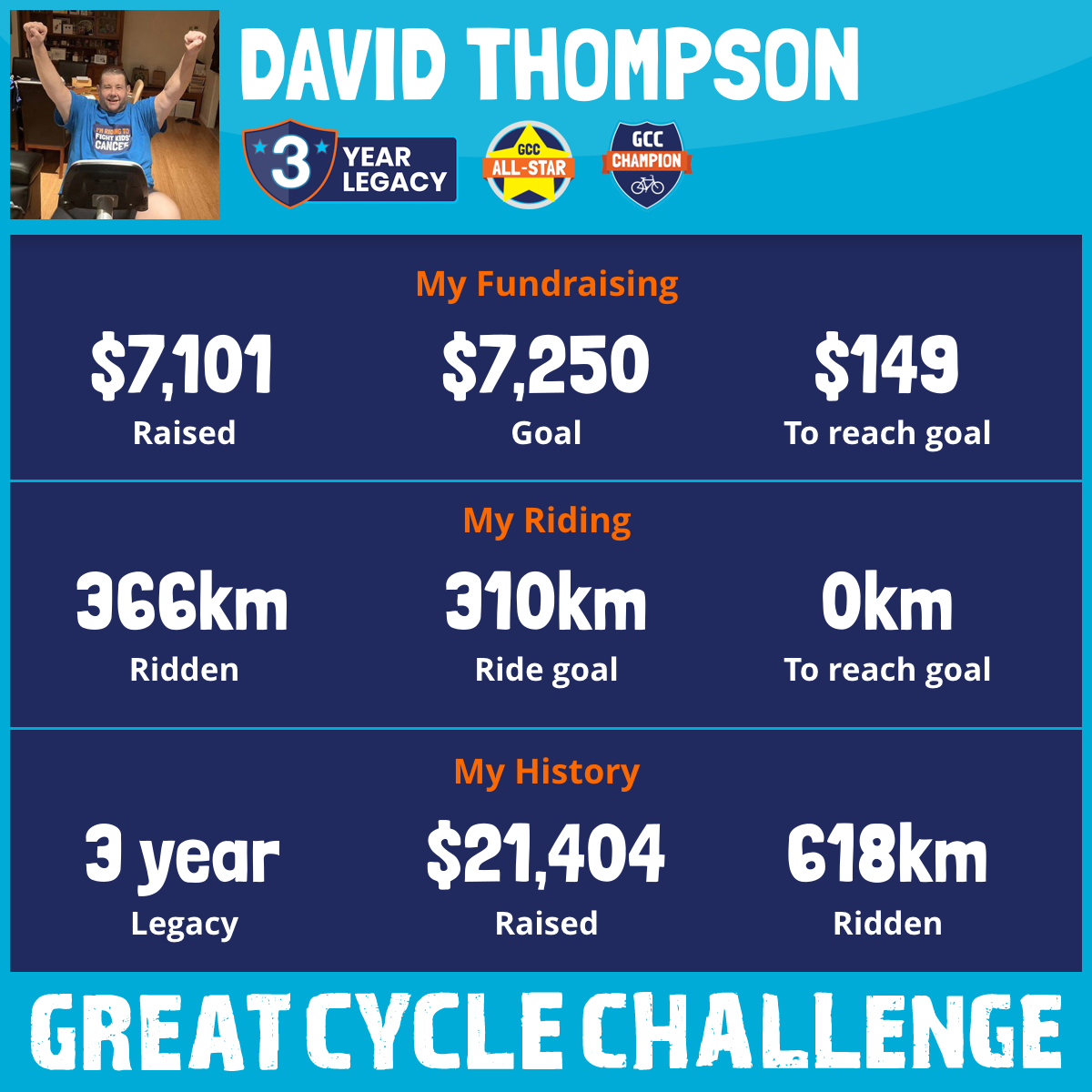 WOW - What a difference a year can make! This time 12 months ago I was wondering if I would live to see the 2025 Great Cycle Challenge and then a miracle happened and I was given the gift of life. On September 17, 2024 I received a liver donation from a stranger who had sadly passed away and today I am now cancer free and getting on with life! To have a second chance at life is amazing and I'm not going to waste it!