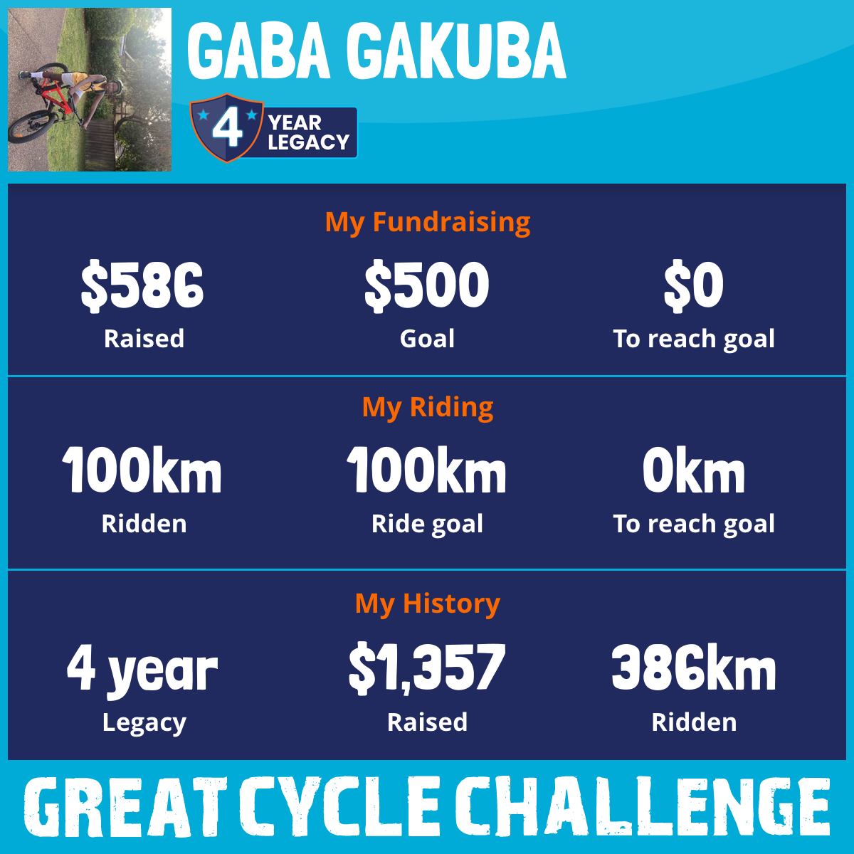 “Hey Gaba! Wow, what an amazing thing you're doing! Cycling to fight kids' cancer is such a cool and important challenge, and it's awesome that you're part of it. Every kilometre you ride is making a real difference for kids who are going through cancer treatment. You're not just riding your bike – you're being a champion for other kids who need help. That takes a lot of heart and courage! Keep pedaling strong, stay safe out there, and remember that all your hard work is helping to support research and families dealing with cancer. You should be really proud of yourself, Gaba! Great job, legend! 🚴‍♂️💪 Good luck with the Great Cycle Challenge, Gaba! You're making Sydney proud! 🌟”