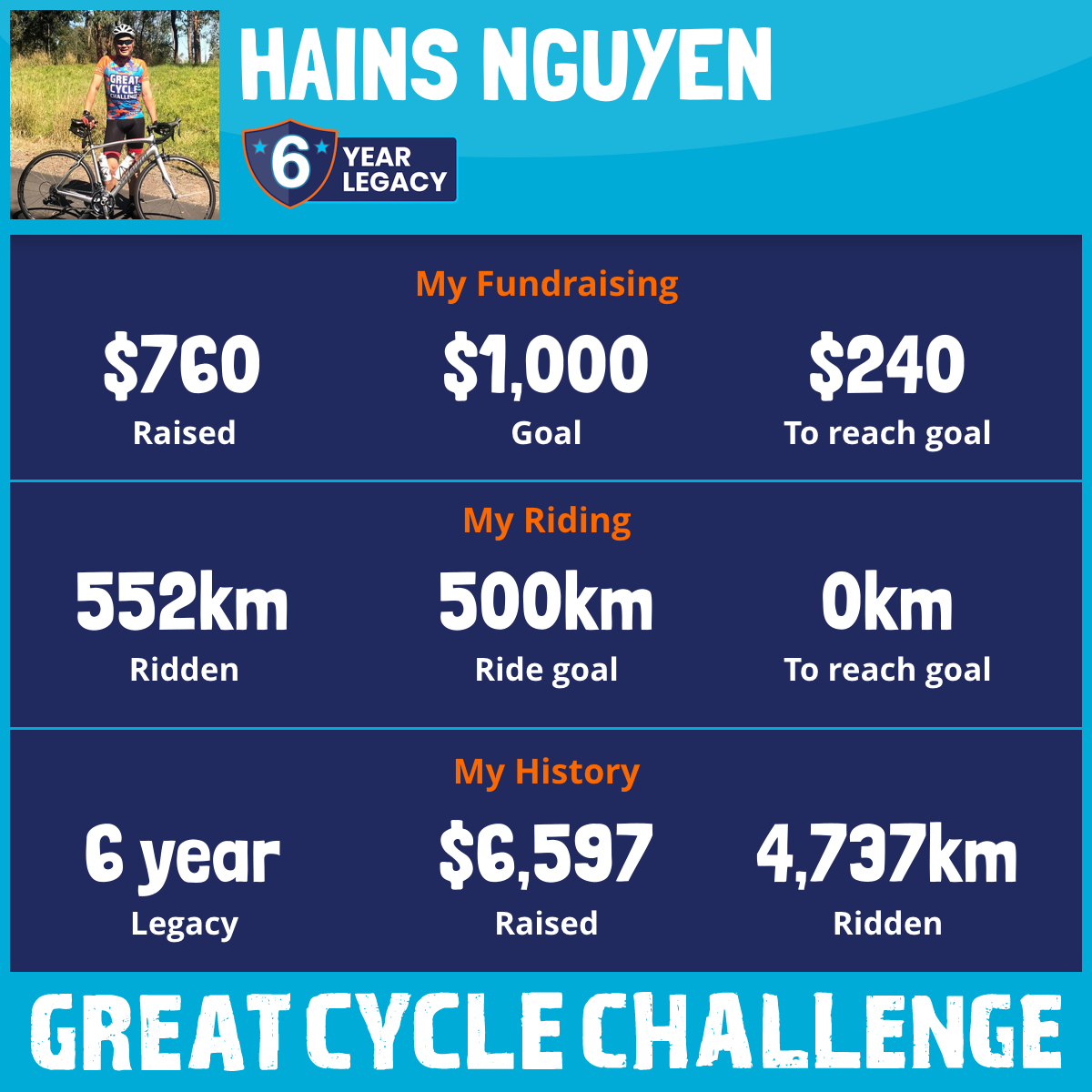 And so I am riding and raising funds to support the Children's Medical Research Institute to continue their work into the prevention, diagnosis, treatment and finding a cure for childhood cancer.