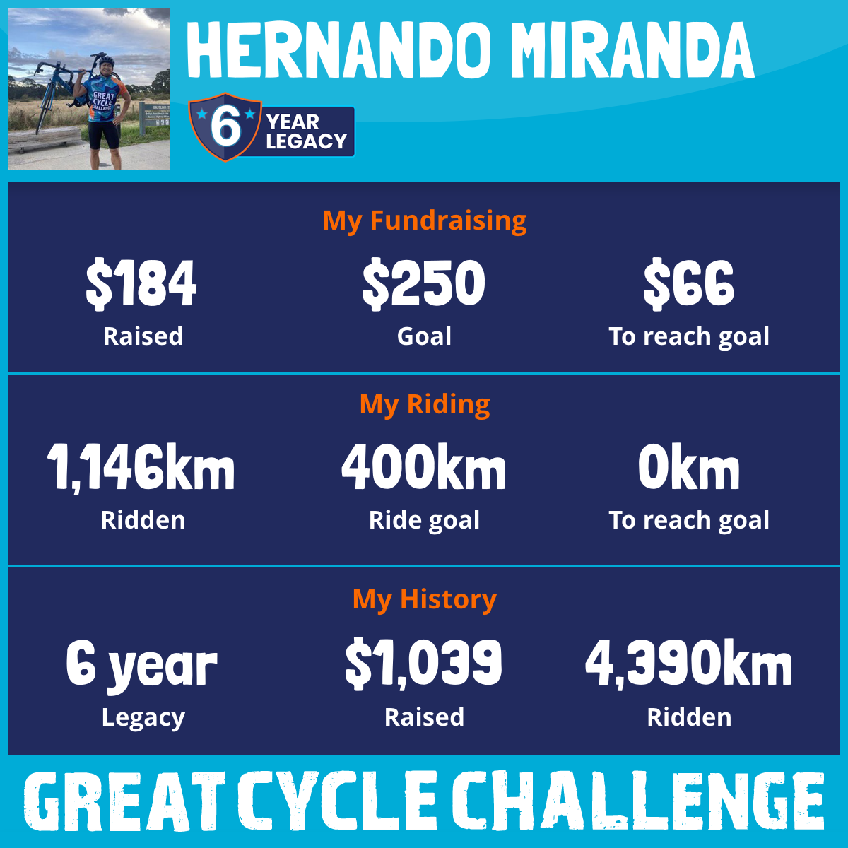 I am riding 400 km in memory of In the memories of my dad Domingo Miranda. Please sponsor me and support my challenge to fight kids' cancer and save little lives.
