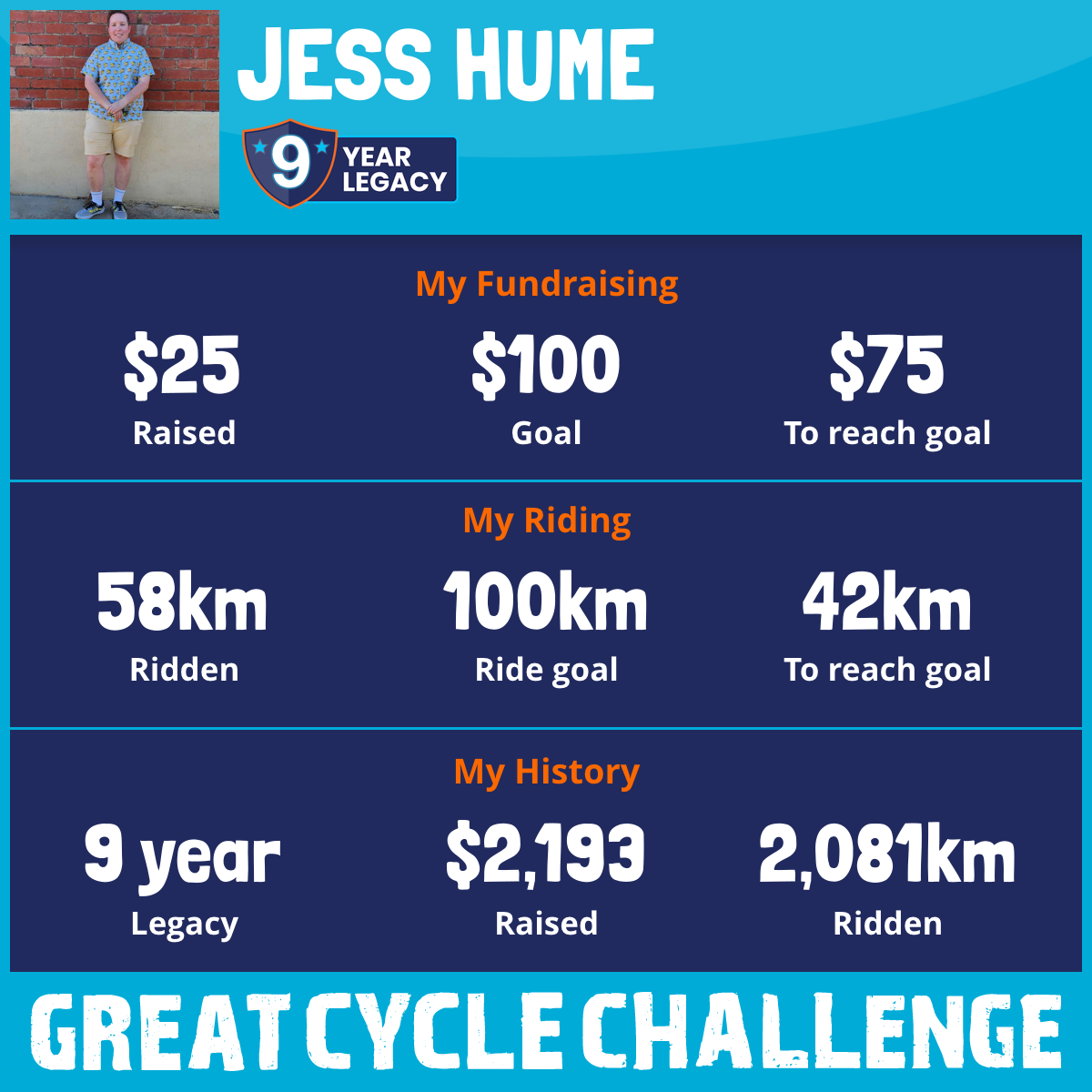 And so I am riding and raising funds to support the Children's Medical Research Institute to continue their work into the prevention, diagnosis, treatment and finding a cure for childhood cancer.