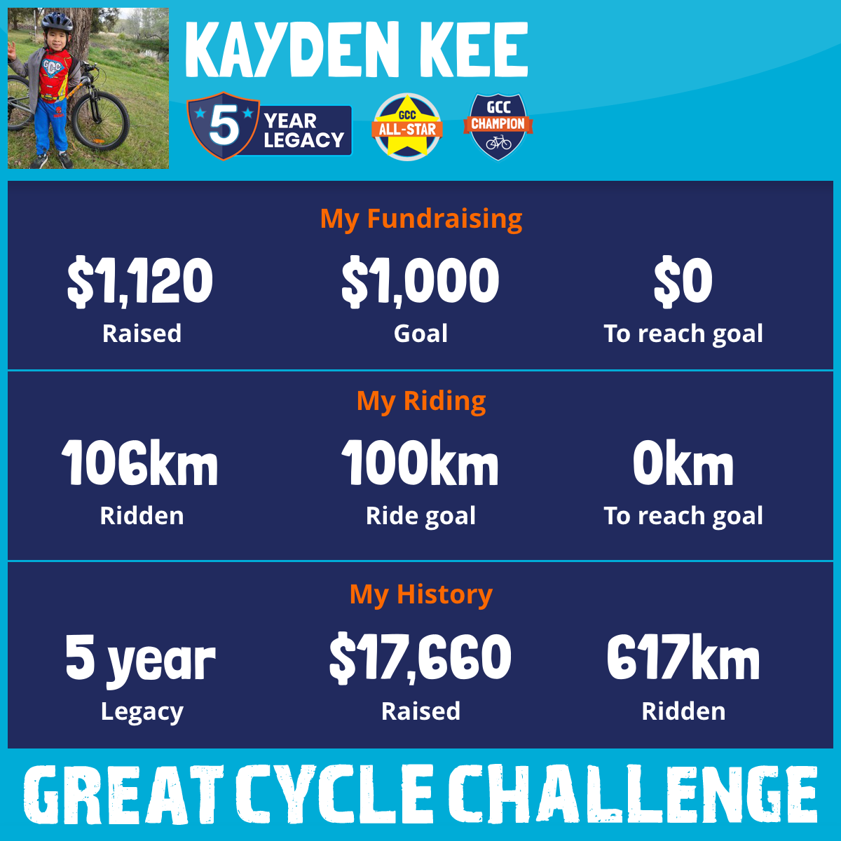 This is my 5th year riding to raise funds to fight this disease called Cancer that affects people of all ages, and people die from it. I am very sad to know kids my age fighting cancer don't get to spend their days enjoying life, pain-free. With this, I have made a pledge to use my skill to to support the Children's Medical Research Institute to continue their work into the prevention, diagnosis, treatment and finding a cure for childhood cancer. I believe Kids should be living life, not fighting for it!
