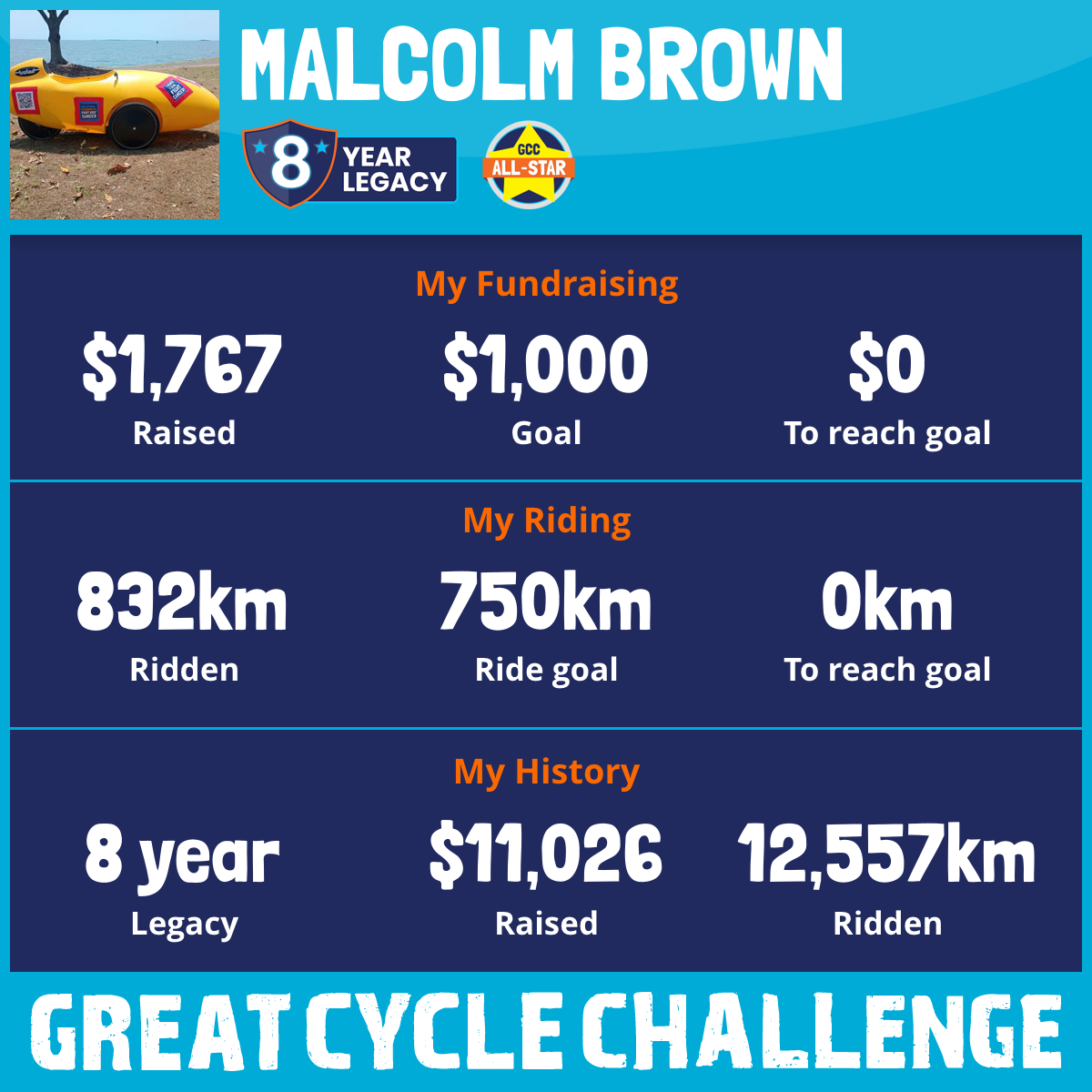 I am proud to say this is my 8th year riding the challenge and raising funds to fight kid’s cancer. Sadly kid's cancer has not been beaten yet and the treatments are still very hard on the children. Having had chemo I feel I have some understanding of the difficulty of what children face. It must be so hard for children to understand. Also, something many don’t understand is often the joy of chemo doesn’t always end when the treatment ends. So, anything you feel able to give will help researchers in their work to help children.