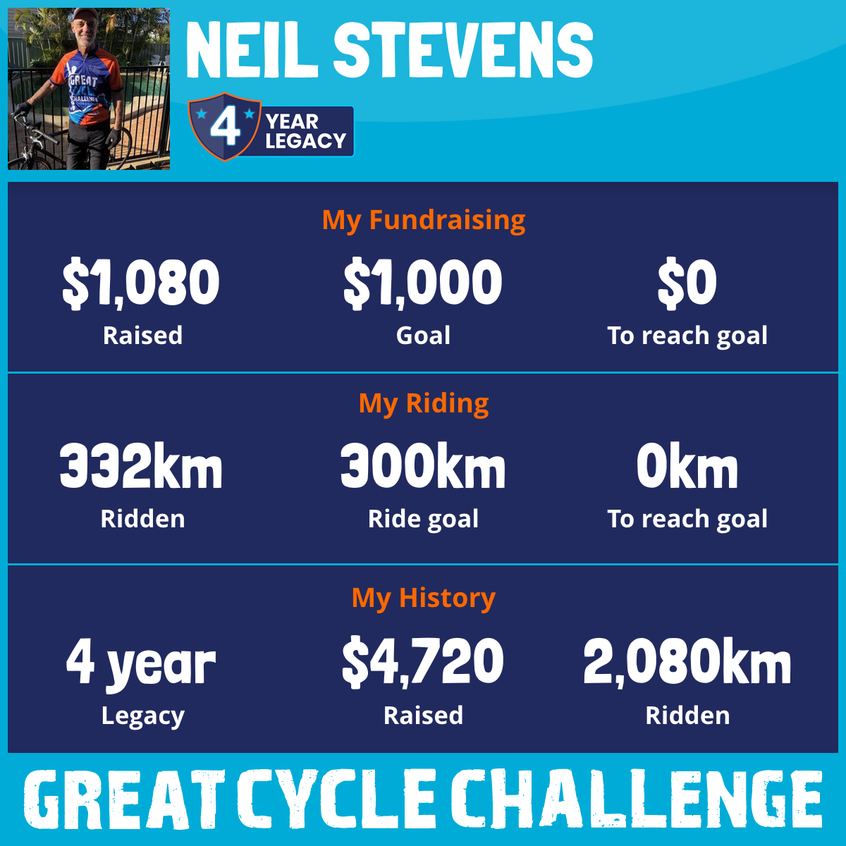 332 km Ridden$1,080 Raised2025
