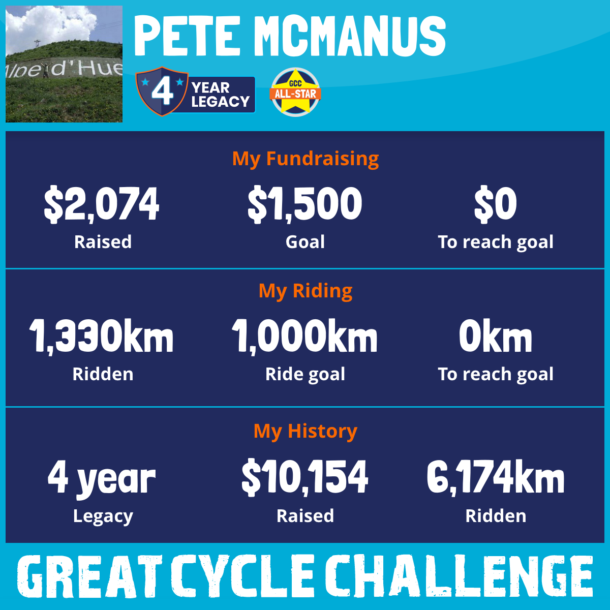 Hi Everyone it’s October again. And this year I am taking part in my 4th Great Cycle Challenge and again like each of the previous three. I’m riding to fight kids' cancer!