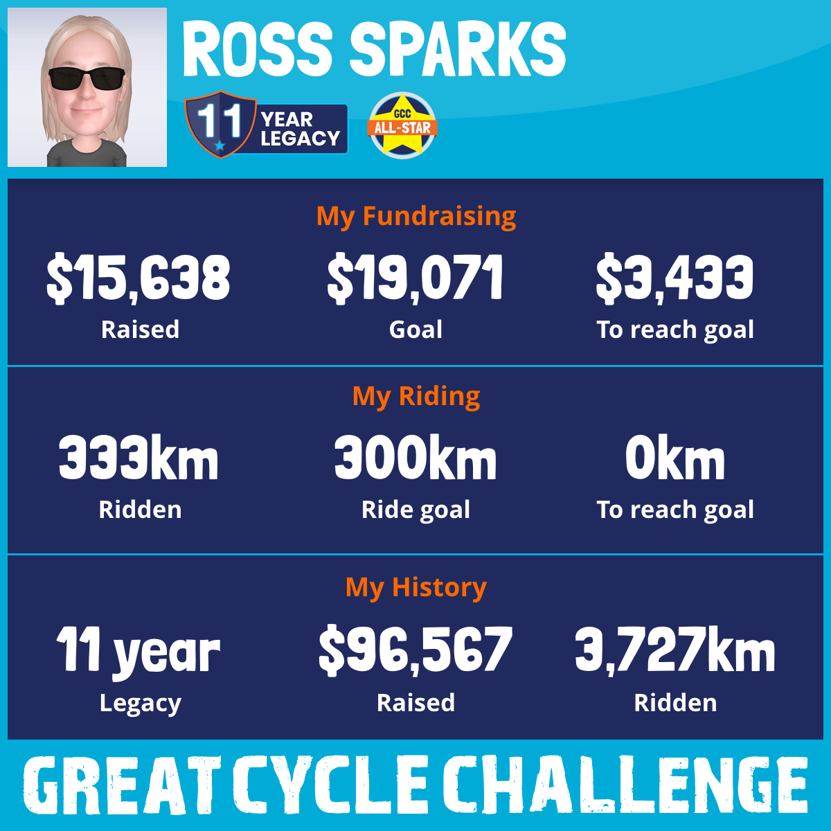 I am riding 300 km in memory of Mum, Glenn, Ray, Lois, Vern, Glenys, Carol, Ken, Kath. Please sponsor me and support my challenge to fight kids' cancer and save little lives.