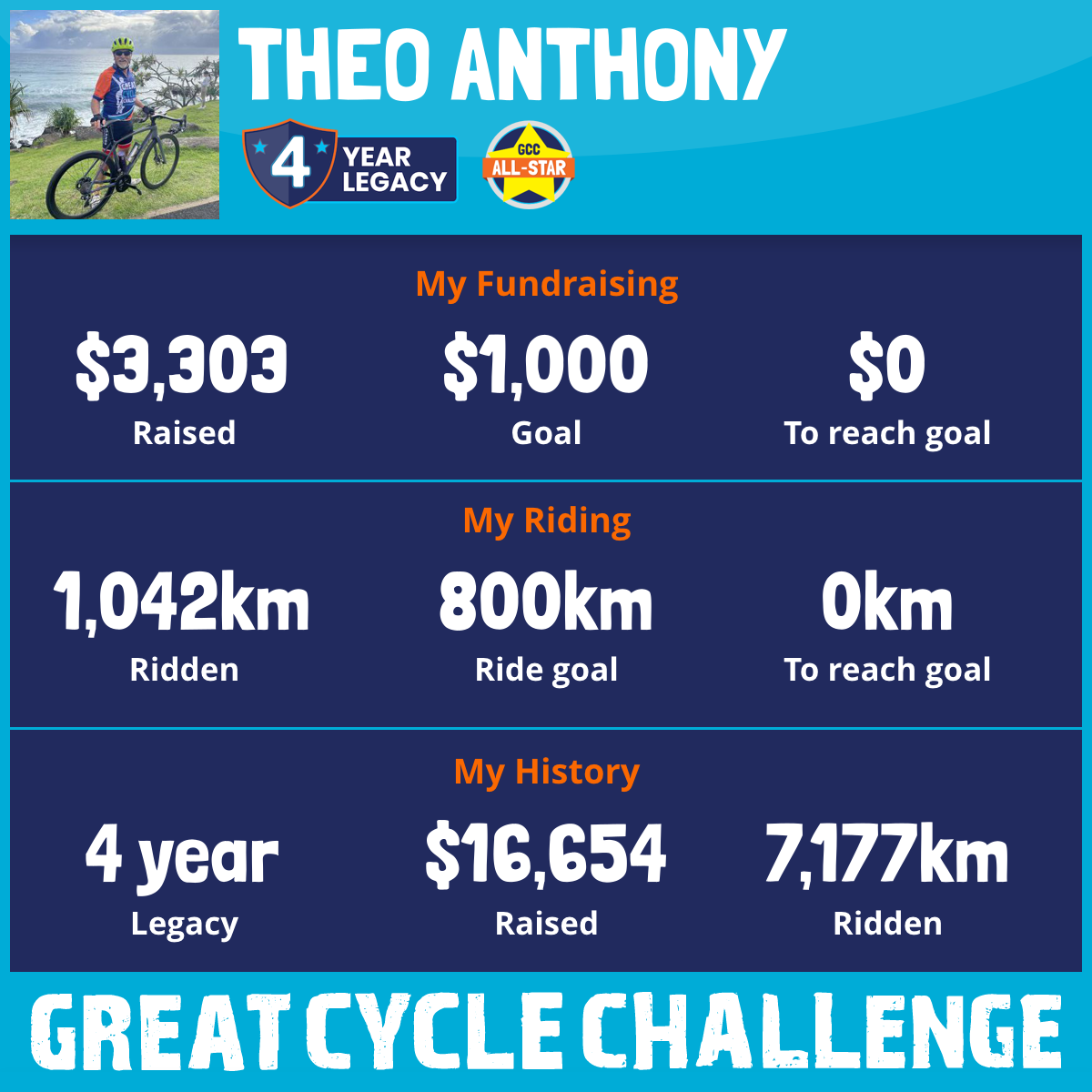 1,042 km Ridden$3,303 Raised2025