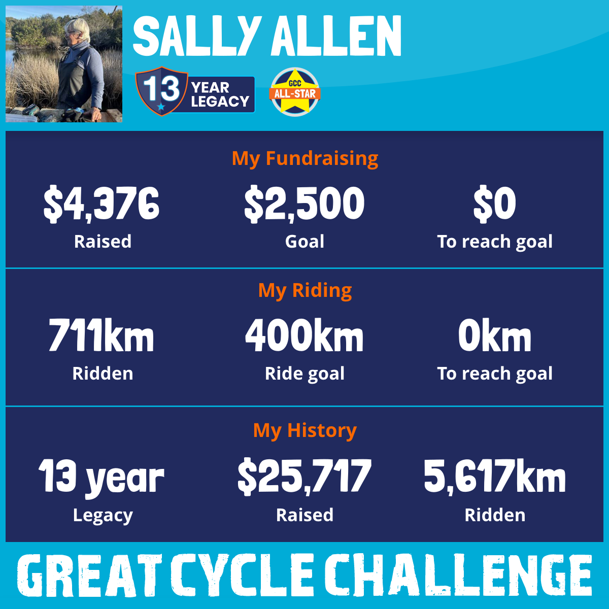 I was to start riding around Tasmania on 1 october, but my sister Margie died after a long battle with a lung disease and I'm still sorting out her household. I intend to go to Tassie on the 12 october but don't really start my ride till about the 20th. So ive had to really reduce the kms i can ride which is a bit lame. But I hope my supporters will see the benefit of a donation is for the better health of children with cancer, not the number of kms i can /or can't ride.