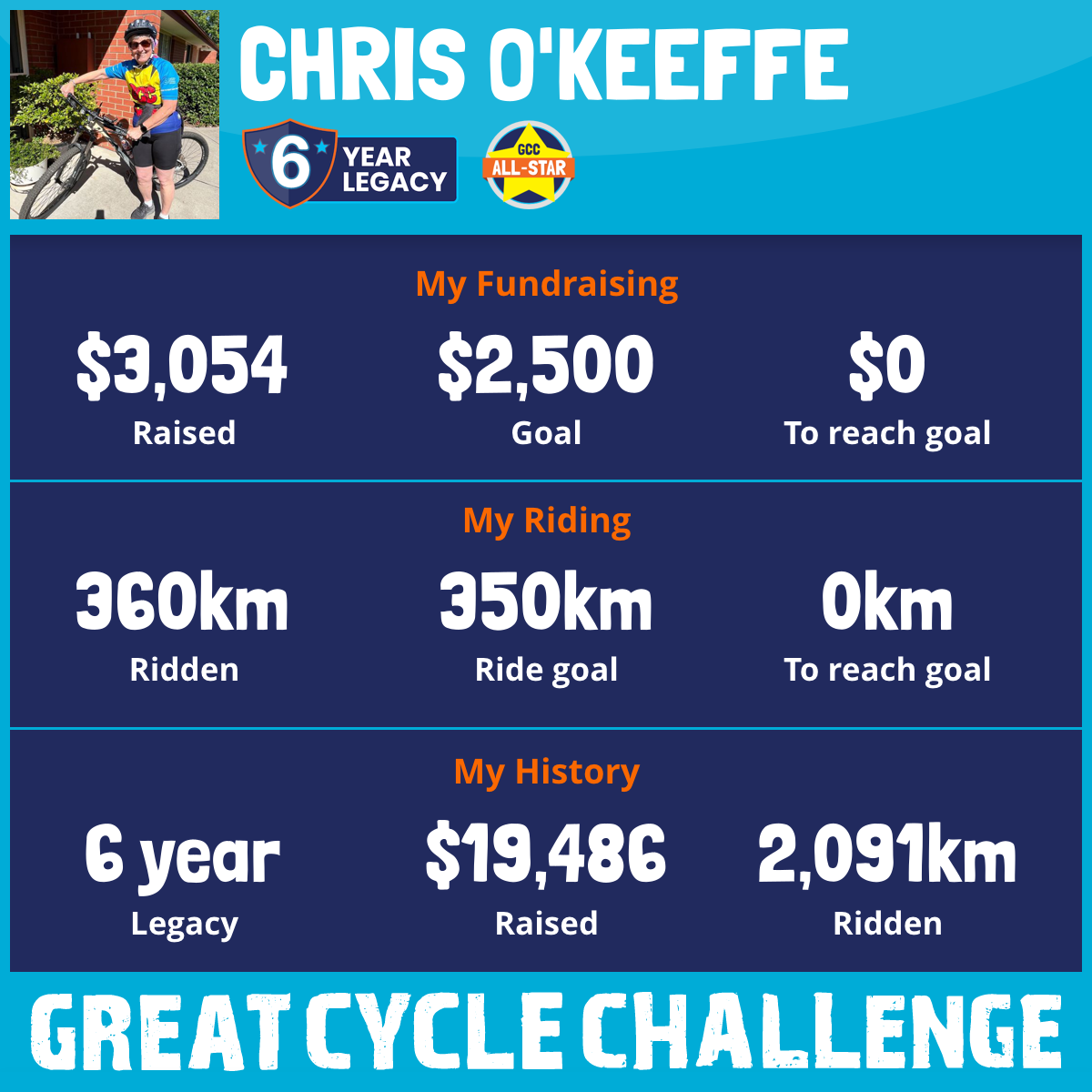 Last year, I was back in the saddle and participated in my 5th Great Cycle Challenge, passing my target goal of 320km and actually riding 372km. I was overwhelmed by the generosity of my family & friends and raised $3,631. I am back hoping to raise funds again for this worthwhile cause, starting with a target of $2,500. I will ride some of my kms on a stationary bike at the gym (when there is inclement weather or as part of my early morning gym visit); some around my local area when I am back in Canberra (and find magpie-swooping-free routes); but the first few kms will have to be jog/walking around the picturesque Adelaide Hills where I will be for a week without a bike. I will be thrilled to be able to raise valuable funds to support the Children’s Medical Research Institute.