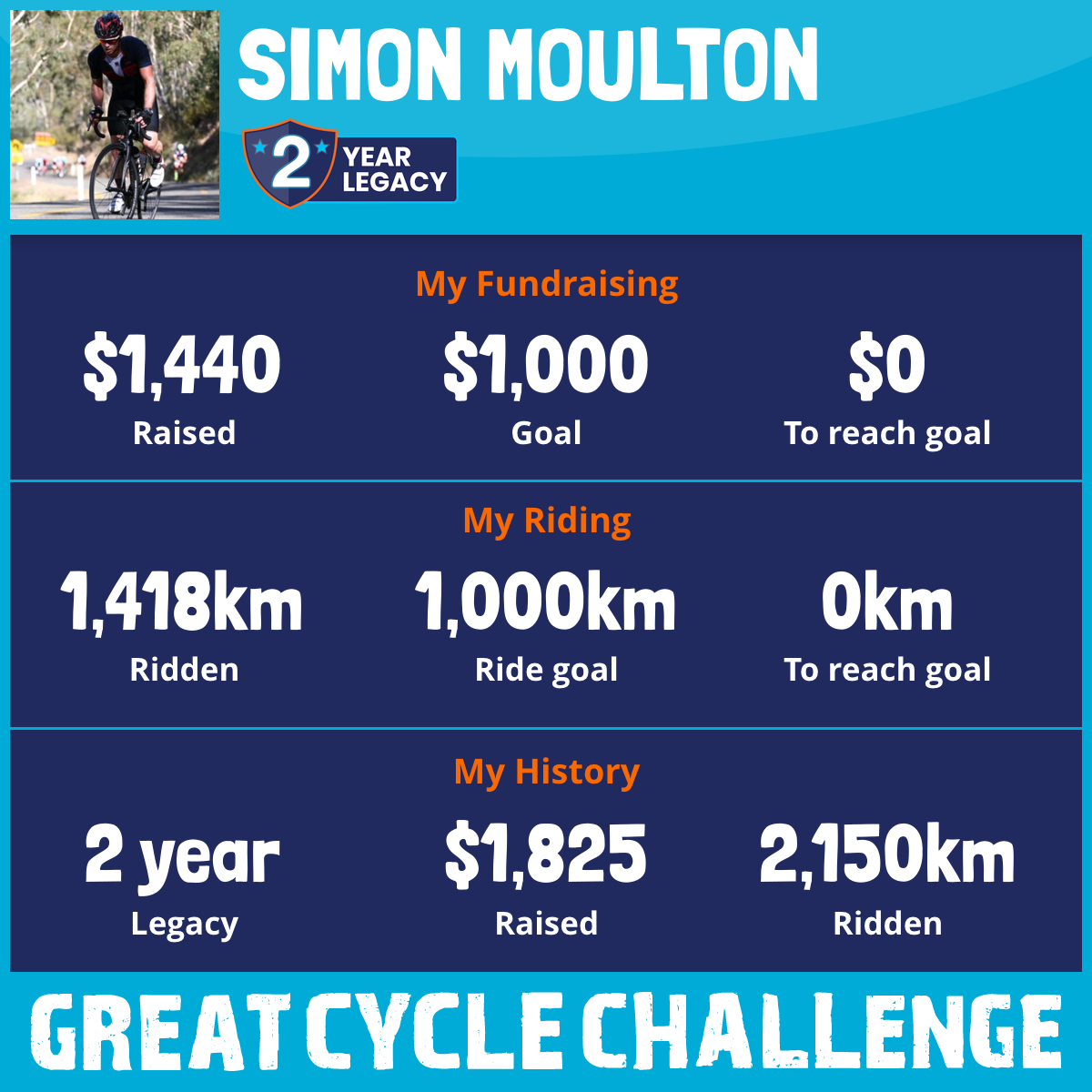 I am riding 1,000 km in memory of my aunty, Aunty Ann and great friend Don.. Please sponsor me and support my challenge to fight kids' cancer and save little lives.